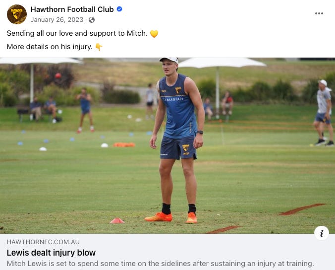 While every Hawthorn supporter has grown to love Day and the admiration for his game from non-Hawthorn people has started to skyrocket, it is not quite as catastrophic as the Lewis injury 12 months ago.