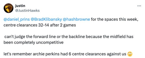For the past two weeks now we’ve lost centre clearances by +9. Jai Newcombe and Conor Nash — a huge part of our midfield turnaround in 2023 — need to arrest their form slump quickly if we’re going to have any chance of being competitive until Will Day’s return.