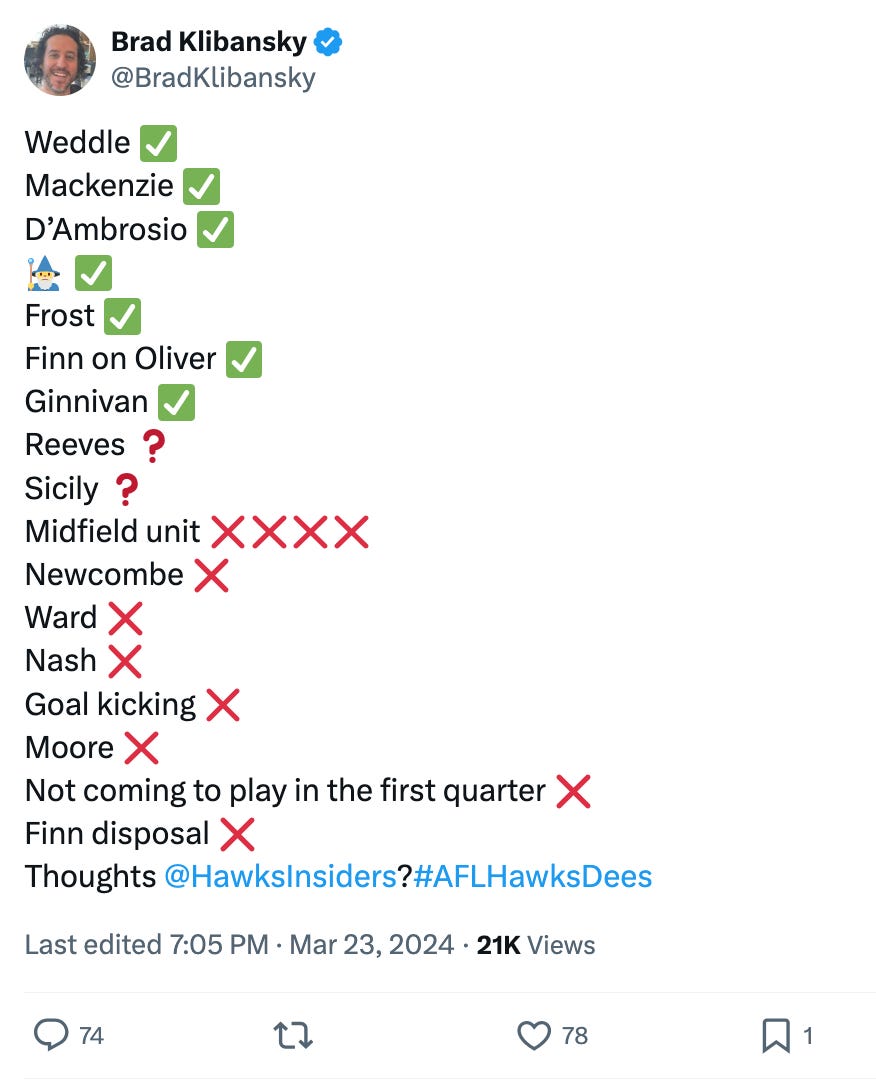 I sort of get what the Hawks were doing early, chipping the ball around defensively, and they got that part of the game right. But they had to take the right opportunities when they present and they had to do so with care for the ball, but they did neither. And that played right into Melbourne’s hands.