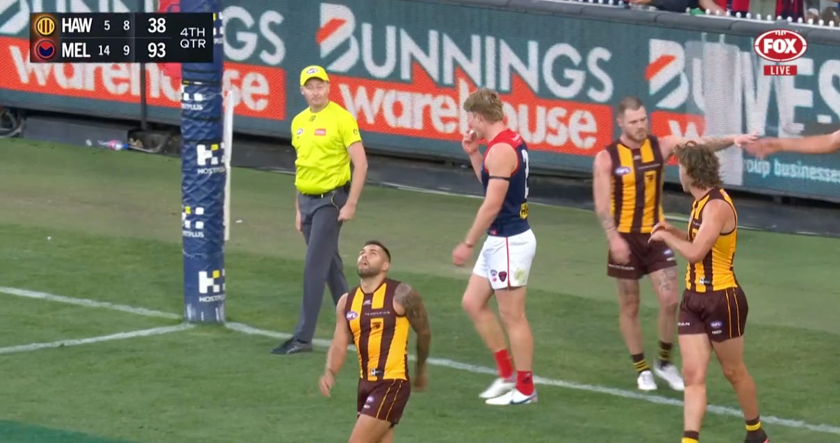 In the absence of James Blanck, Frost has started the year really well. But with 40 seconds left in the final quarter and with Hawthorn 55 points down to the Demons, he dropped an absolute soda that summed up one of the worst days at the footy in recent memory.