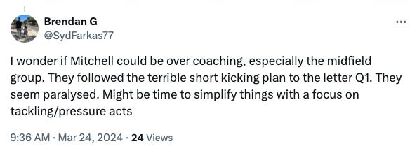 Great comments Mick. The main issue with the approach taken in Q1 is that it stifles our development. We need to develop an overall style of play that can hold up and going right away from that due to the strengths of the opposition is concerning as it suggests that there is a lack of belief in the style of play we're trying to develop.