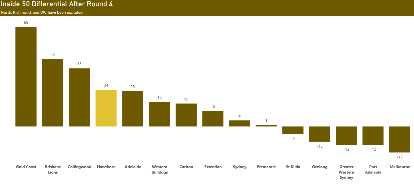 It is early, and the sample size is small. Not only have teams played just a handful of games, but the difference in the difficulty of those games can vary quite widely. We have played some tough opponents (GWS, Sydney, Carlton, and Essendon). The stats for teams that have played West Coast, for example, will probably look quite a bit better than ours.